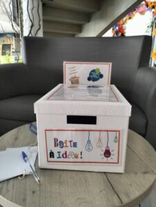 Des boîtes à idées sont disposées dans chaque unité de vie, dans le hall d’accueil et au P’tit Café, vous permettant de déposer vos suggestions, remarques ou questions concernant la vie de l’établissement. Ces boîtes sont relevées avant chaque Conseil de la Vie Sociale, soit 4 fois dans l’année.